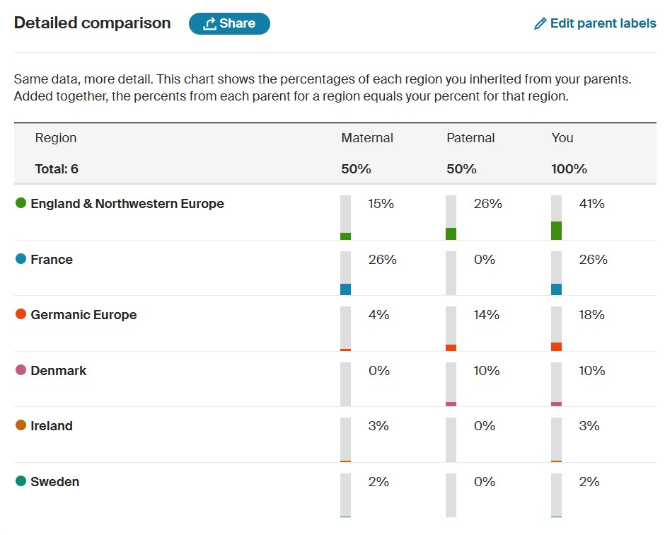 An overview of my AncestryDNA ethnicity results (reflecting their October 2025 major region update) shows my DNA inheritance as follows (click an image to enlarge):